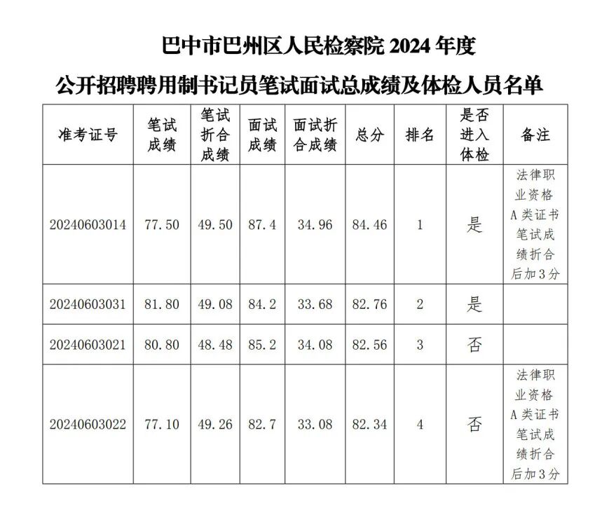 按照《2024年度巴州区人民检察院公开招聘聘用制书记员公告》相关要求,现将笔试面试总成绩及体检人员名单公告如下: