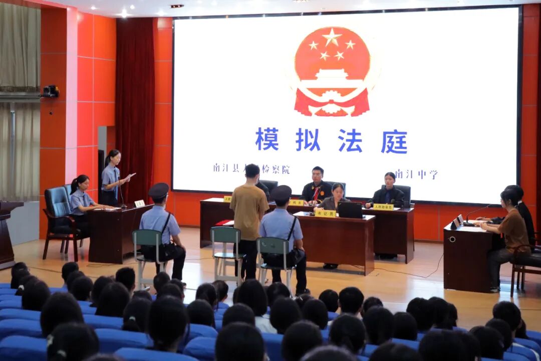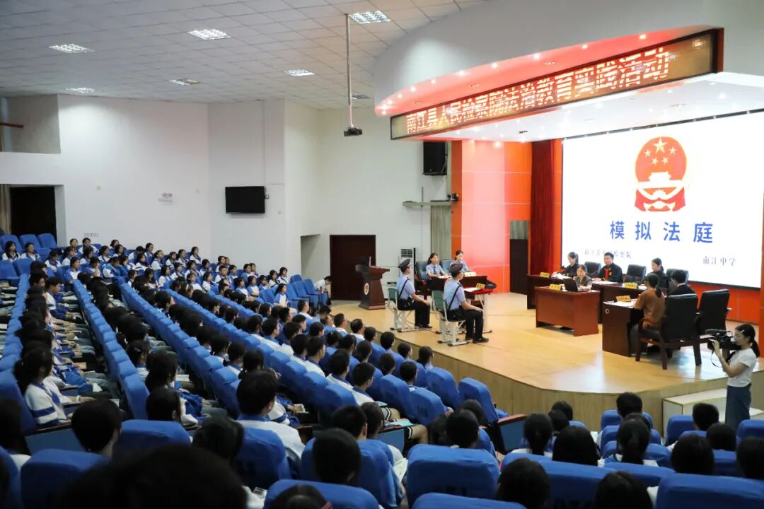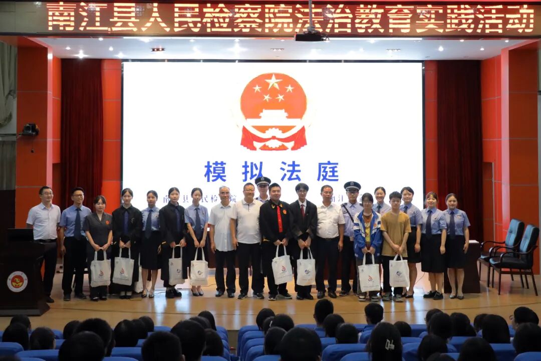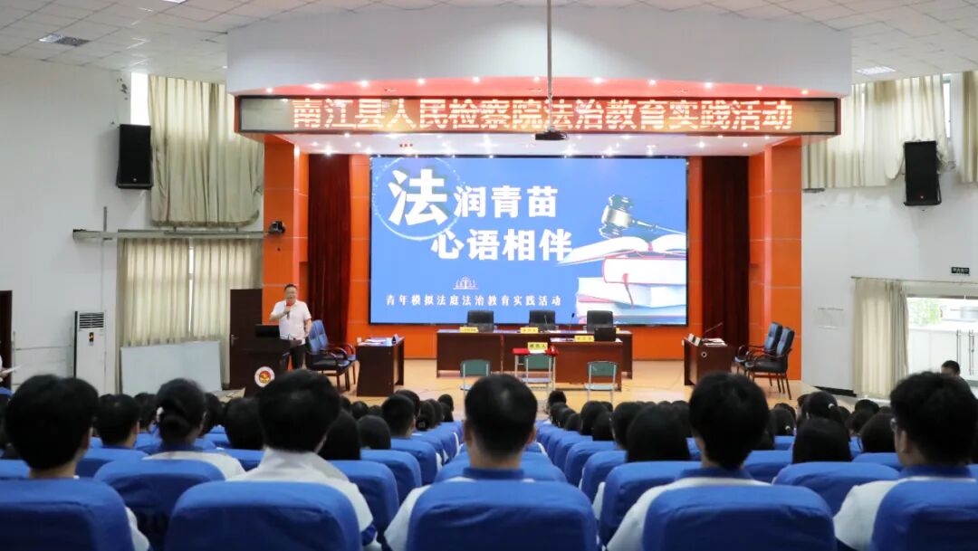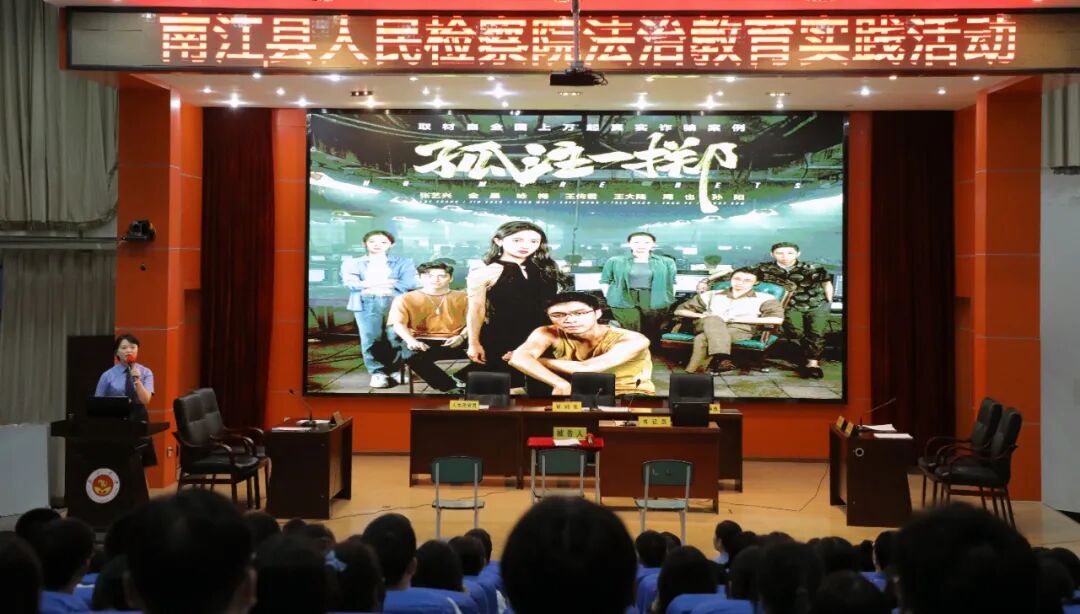 为提高学生群体的反诈法律知识,南江县人民检察院检察长、南江中学法治副校长王波携心语姐姐团队,将真实案例改编的庭审式法治剧本《正义使者找“卡农”》带到校园,开启了一场“沉浸式”普法。南江中学党委书记王波、校长龙地金及300多名同学到场观摩。