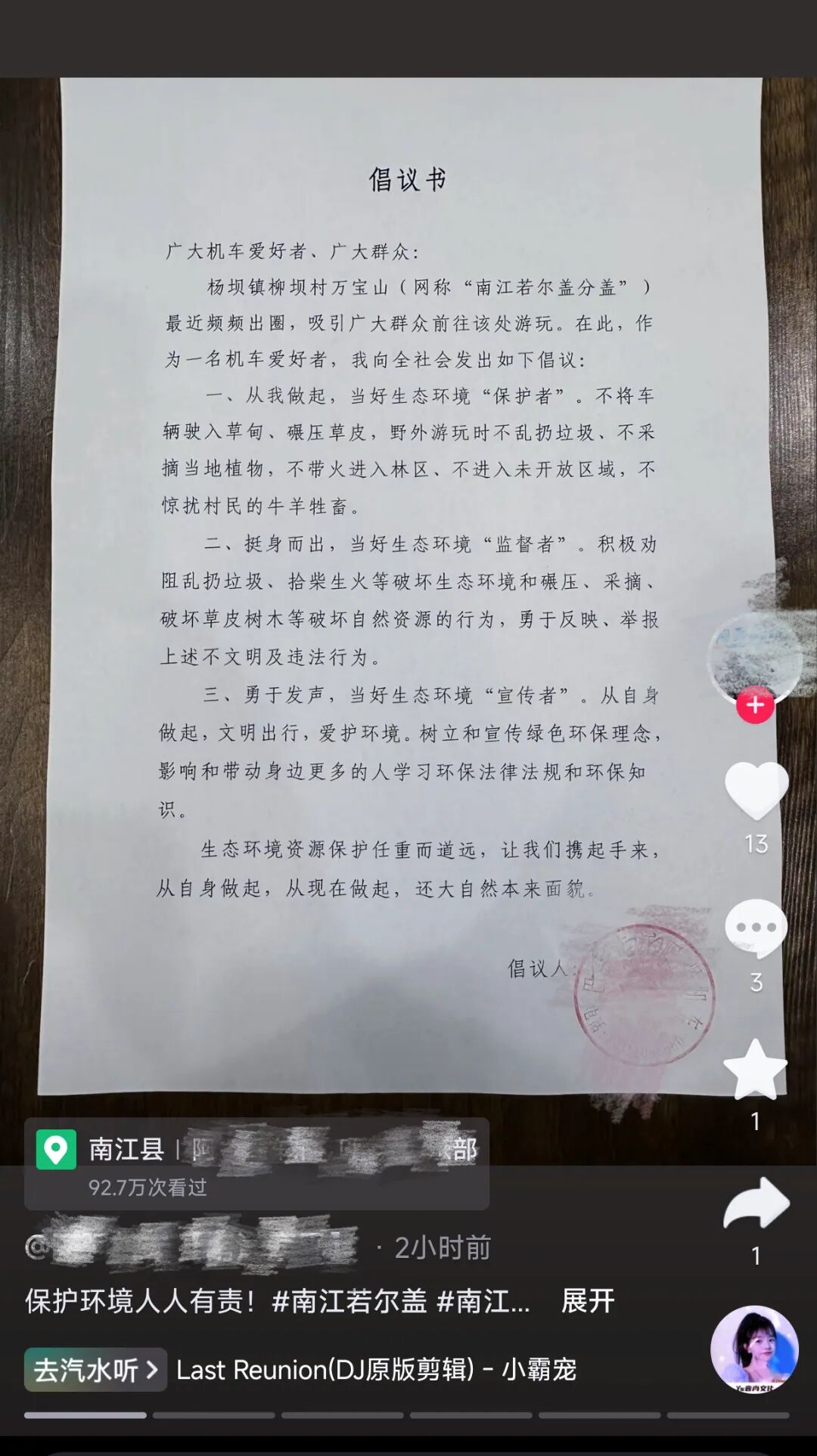 “你刷到了吗?之前碾压草皮的‘摩托哥’发了一份保护生态环境的倡议书。”今年4月,某机车爱好者在某短视频平台发出保护生态环境的倡议,这一转变引得群众的热烈讨论。