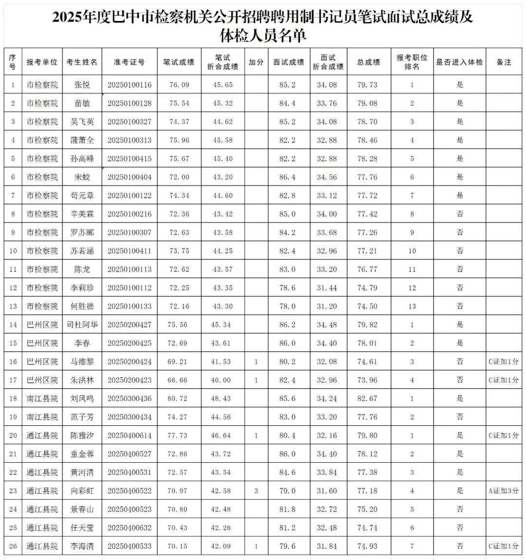 笔试面试总成绩及体检人员名单