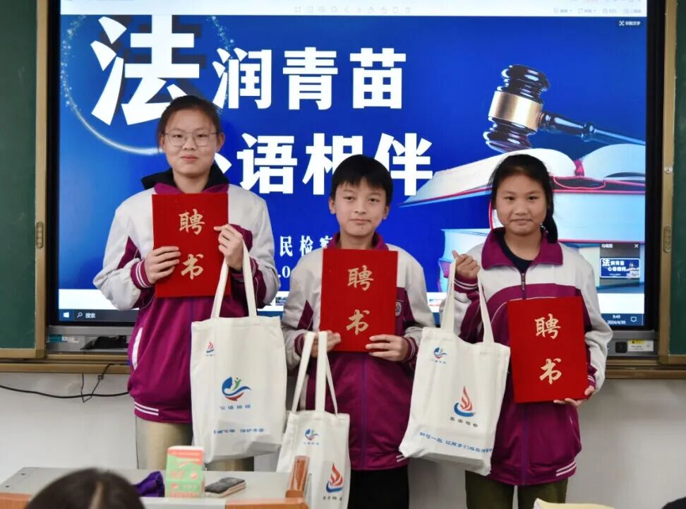 为弘扬社会正气,鼓励更多的青少年以法之名保护自己、帮助身边人。近日,南江县检察院赴南江县某中学初二年级(18)班举行“心语•阳光”红叶工作室志愿者聘任仪式,聘任三名见义智为的好青年为志愿者,并鼓励他们好好学习,长大后帮助更多的人。